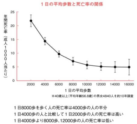 「1日の歩数が多いほど死亡率が下がる傾向がある。そのピークは1日5000歩。1万歩以上までは大きな差がない。」