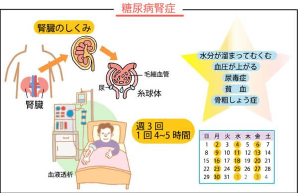 腎症が進行すると人工透析が必要になり、週に数回の治療が必須となり、日常生活に大きな制限を受けることになります。