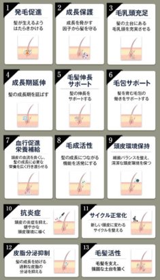 日本で発売されている育毛剤、発毛促進剤は下記13種類のどれかの効果なのです。
