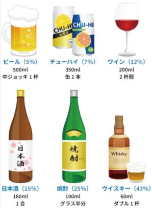 20gをお酒別に置き換えると、ビール5%なら500mL、日本酒15%なら1合(180mL)、ワイン12%ならグラス2杯(各125mL想定)、缶チューハイ7%なら350mLとなります。