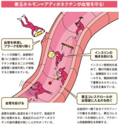 血液中を流れて全身を巡っているアディポネクチンは、血管が傷ついているところを見つけると、すばやく入り込んで修復しますので、動脈硬化を防ぐ働きがあります。