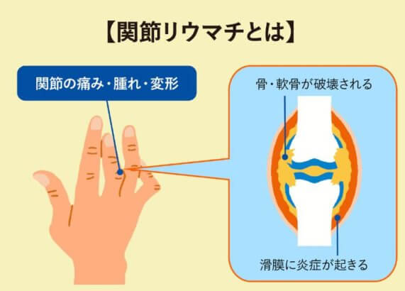 関節リウマチは手足をはじめ、全身の関節が腫れて痛み、特に手指がこわばったり、進行すると関節が変形したりする病気です。
