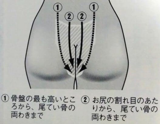 マッサージは、親指と小指を除いた3本の指の腹で骨盤から尾てい骨に向かって乾布摩擦の要領で刺激します。