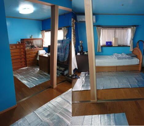 だから、天井も壁も真っ青です。(クロス張りでなくシリコン塗装)