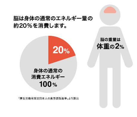 脳の重さはだいたい体重の2%ほどですが、脳がきちんと働くためには、1日分の消費エネルギーの約20%も必要です。