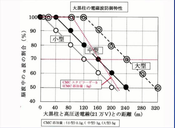 大黒柱には小型で0.1g、中型で1g、大型で5gのCMCが添加されています。この結果、大黒柱の大があれば21万Vの高圧電線があっても240mまでは脳に全く悪影響を与えないという結果になっています。