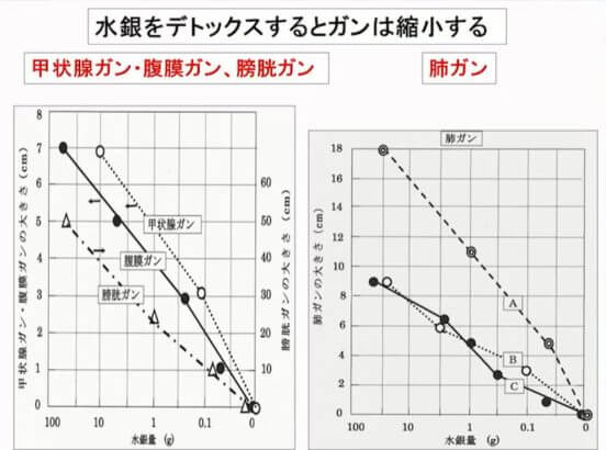 例えば、各種ガンの大きさは体の中に蓄積した水銀量と相関関係にありますが、この水銀をデットクスするとガンは縮小することが分かっています。
