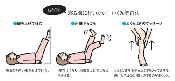 ふくらはぎのストレッチとマッサージも効果的です。ふくらはぎを心地よく伸ばし、両手で包み込むように足先から心臓方向へさすり上げてください。さらに、ふくらはぎの内側と外側の筋肉を鍛える体操により血液循環が改善され、むくみが解消されます。