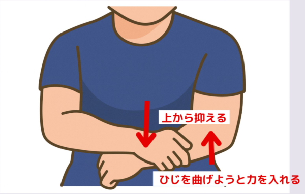 手のひらを下向きにして肘を曲げる方向に力を入れ、反対の手で手首が動かないよう固定します。肩の前部分に力が入ることを確認しながら、10秒間×3回実施してください。