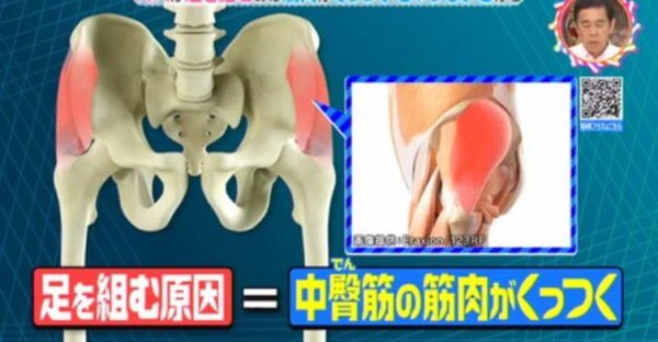 解説は大阪産業大学の蒲田和芳非常勤講師で、中殿筋の筋肉が”くついている”から足を組むのだそうです。