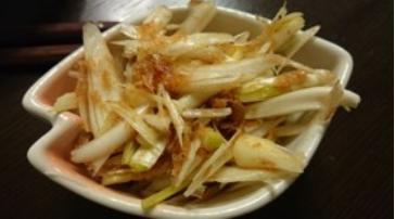 繊維にそって薄切りしたらっきょうを2~3分間水にさらし、それに薄口しょうゆ、米酢を加えて、削り節と混ぜるだけです。