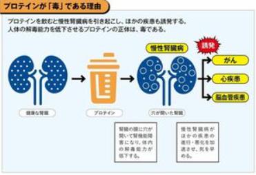 プロテインが腎臓に悪影響を与える理由は、過剰なタンパク質が体内でアミノ酸に分解され、その過剰なアミノ酸が尿素などに変わり、腎臓を通って排出されるからです。
